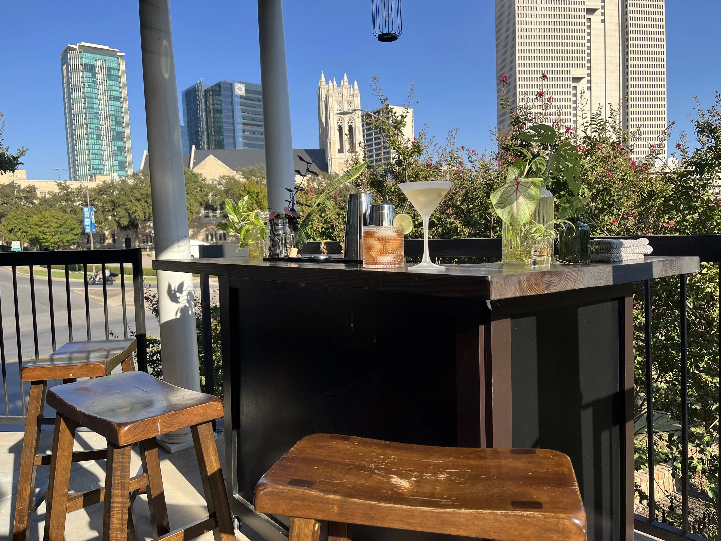 Your booking includes TABC Certified Bartender(s), and a unique and personalized beverage approach to fit the style and mood of your event. Garnish prep, and home-made beverage syrups to add enjoyment and visual aesthetic. Stylish Wooden bar-top, Bar set up and tools, Napkins, and Cocktail Stirrers. Depending on your package option, we additionally offer rental glassware, and custom made menu design!